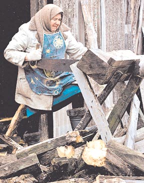 Una ucraniana serrucha leña en