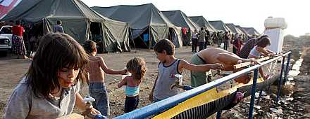 Un grupo de desplazados toma agua en un campo de refugiados de Tiflis. (Foto EFE) |
