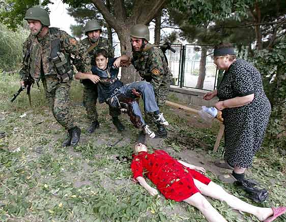 Tres soldados recogen a un niño herido ante el cuerpo sin vida de una mujer, tras el ataque aéreo ruso. (Foto: Kurab Kurtsikidze/EFE).