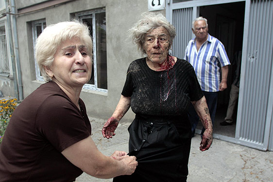Una mujer de Georgia ayuda a su vecina herida a salir del edificio bombardeado por las fuerzas militares rusas. (Foto: George Abdaladze/AP).